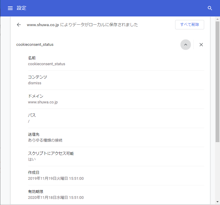 ホームページに埋め込まれた Javascript は cookieconsent_status を見てこれが有効期限内であれば、同意を求める画面の表示は行いません。