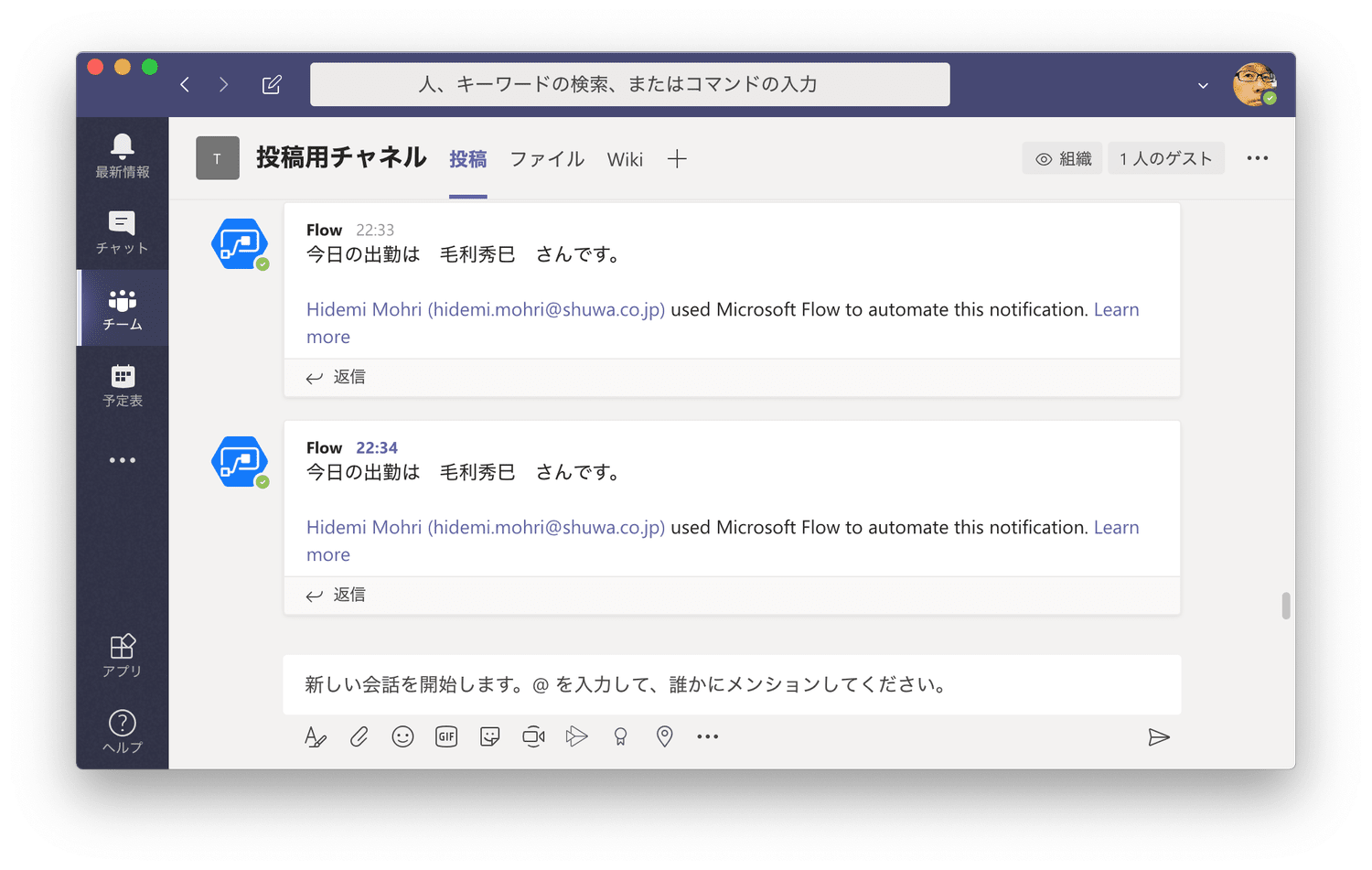 1日に1回この中から「本日」出勤の人の名前を Teams に投稿することにします。