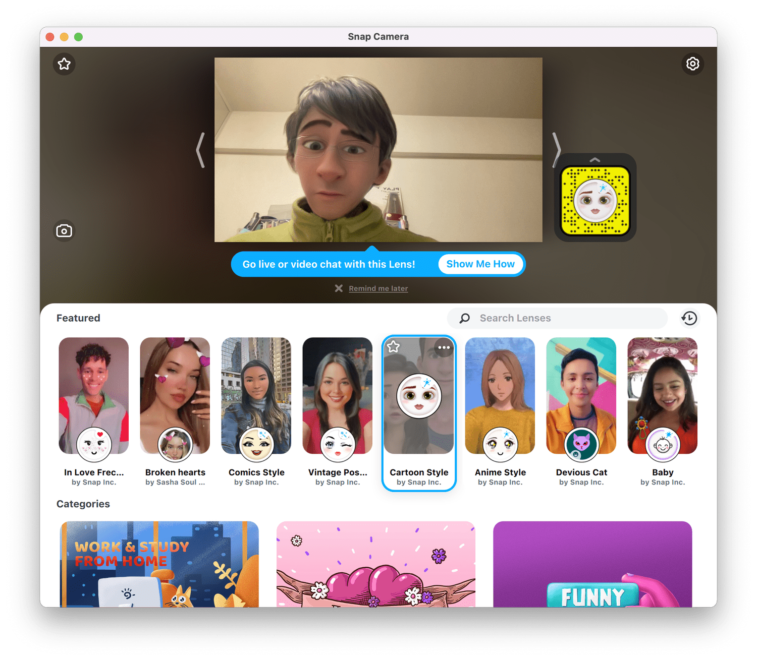女子大生の皆さんは授業で顔を見せたくない人も多いと聞きます。Snap Camera で変身しての授業は許可してもらいたいですね。