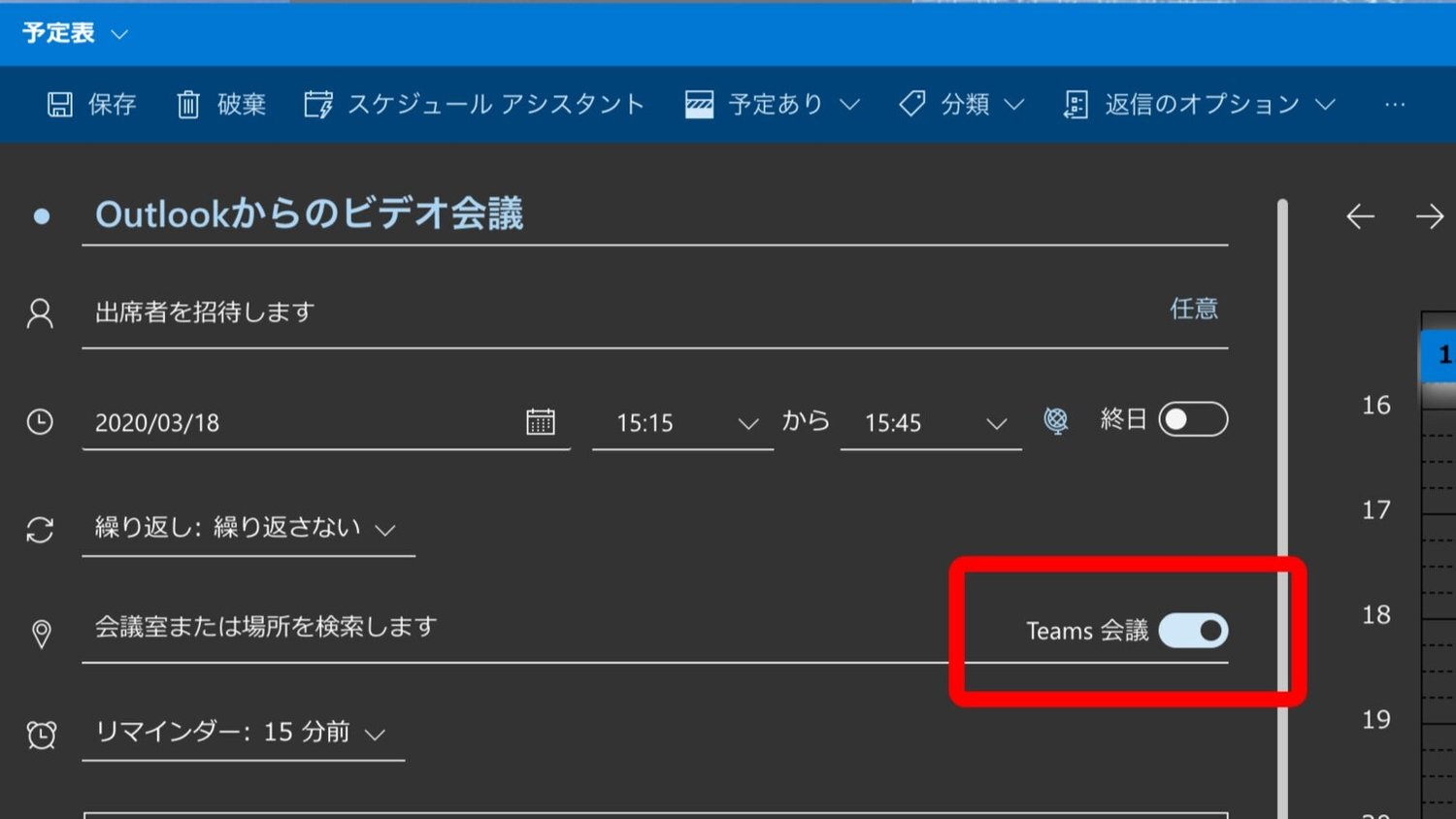 場所を指定する部分で「Teams 会議」のスライドボタンをONにします。
